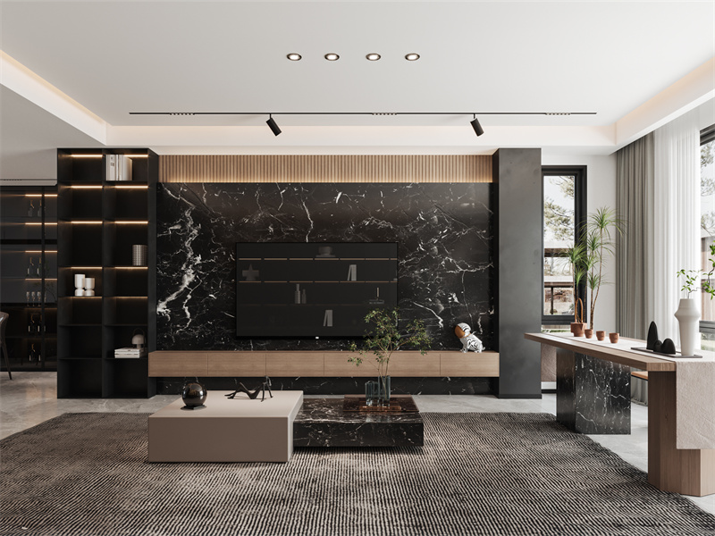 本案通过大理石的奢感、金属的精致线条与木质的温润质感相融合,搭配几何吊灯、艺术摆件等细节,让各空间既适配休闲、社交、品茗等多元生活场景,又巧妙平衡美学表达与实用功能,尽显品质生活的优雅质感。