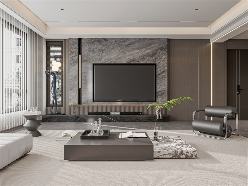 本案采用意式极简风格,以灰、棕等中性色调为主,搭配大理石、皮质等元素,整体空间通过简洁的线条、精致的细节与合理的布局,传递出优雅从容的居家生活格调。