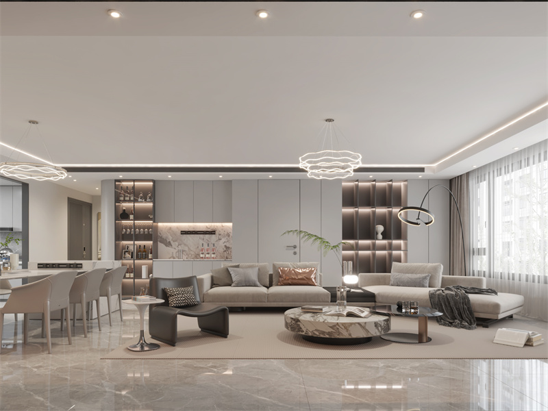 本案秉持意式极简风格,以灰白、深灰、木色等为主色调。客厅借无主灯与线性光营造柔和氛围;餐厨开放式布局让烹饪用餐互动自然;卧室隐藏灯带增添温馨感;酒吧台暖光烘托雅致小酌氛围。各空间通过简洁线条与质感材质,构建出舒适且具格调的生活场景。