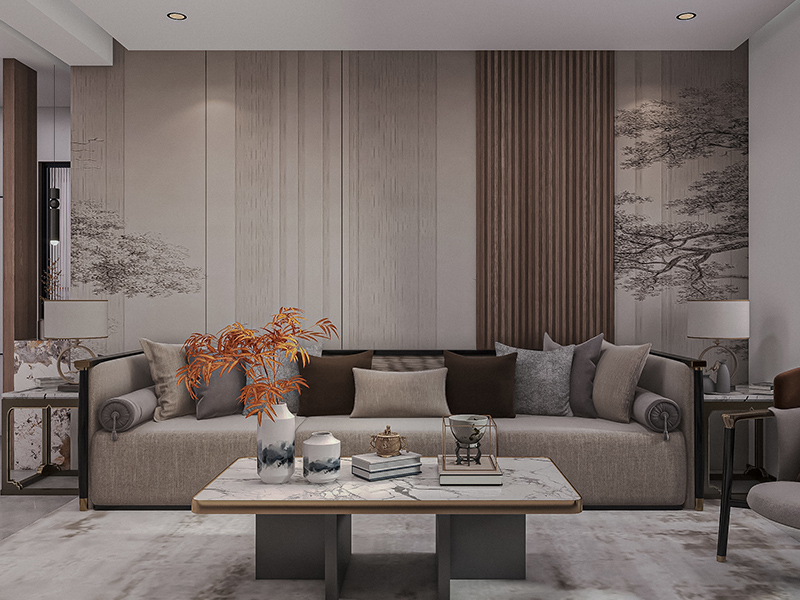 以新中式与现代融合,通过木色、山水元素传递东方韵味,同时融入现代材质与功能设计。