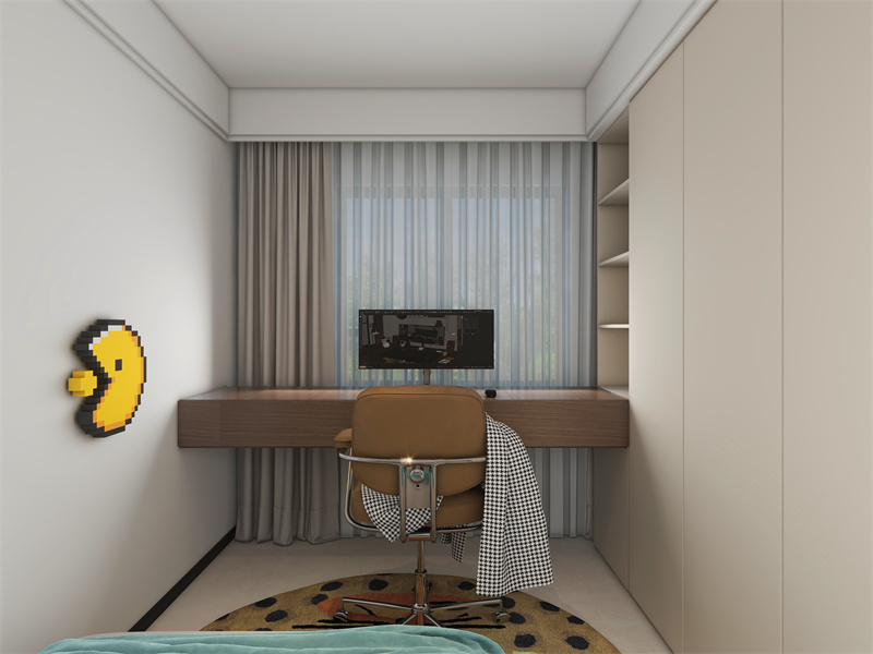 整体白色基底,深木色书桌形成对比。像素装饰画添趣味,简洁柜体满足书籍或衣物收纳。日常可在此专注办公、阅读等,窗帘保障光线调节,椅子搭格纹布,营造轻松又不失秩序的环境。