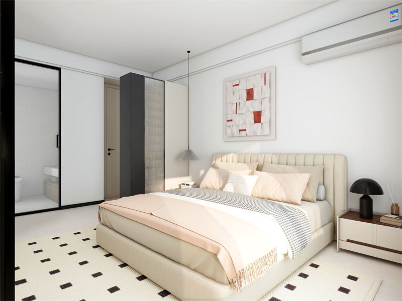 以白、米白为主色调,营造简洁静谧氛围。软包床头搭配浅粉床品,柔和温馨。隔断与简约家具划分空间,满足睡眠、收纳等日常需求,几何图案地毯添细节,让休憩时光舒适又具设计感。