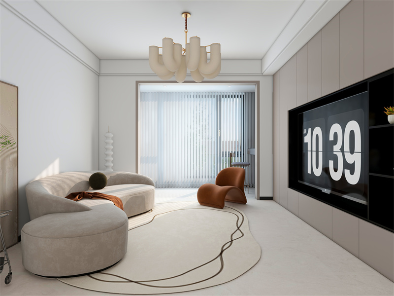 米白、棕色调营造简约温馨感,弧形沙发、独特单椅舒适别致。异形地毯、造型吊灯强化设计,大电视墙实用又具视觉焦点。日常可休闲观影、会友,光线透过百叶窗,让空间明亮又松弛。