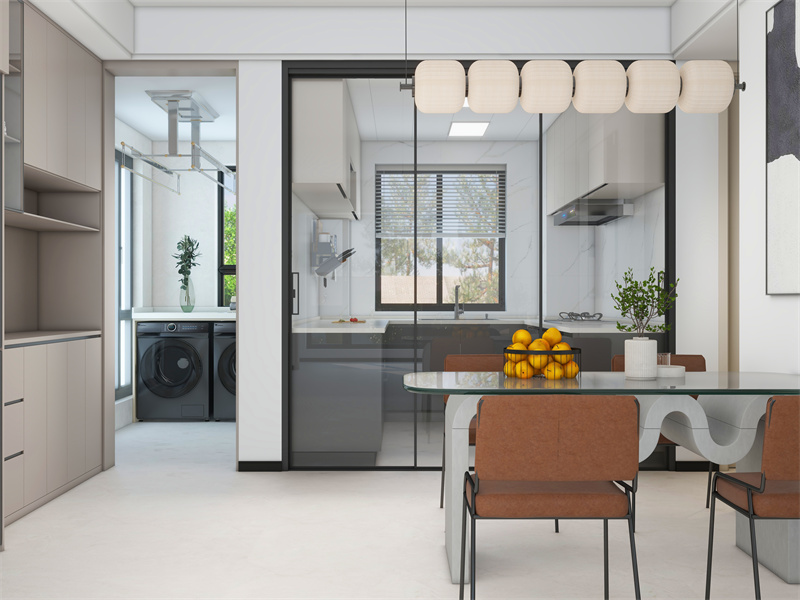 浅灰与白色搭配,通透玻璃门连接空间。餐厅玻璃桌面、棕椅简约时尚,厨房收纳规整。日常烹饪、用餐流畅衔接,水果绿植点缀生机,洗衣区嵌入,实现功能整合,适配当下生活节奏。