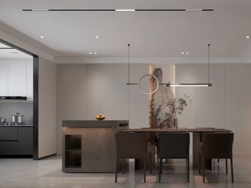 整体采用浅棕、灰色调,搭配简约吊灯,尽显现代简约的质感。长餐桌与深色餐椅,方便家人围坐共享美食。开放式布局增强了与其他空间的互动,传递出温馨的用餐氛围。