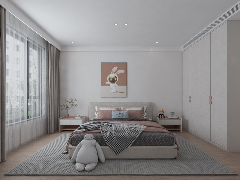 以白、浅粉为主色,搭配可爱装饰画与柔和灯光,营造出温馨氛围。大窗户引入充足光线,舒适的床品与实用衣柜,满足休息、收纳等需求。