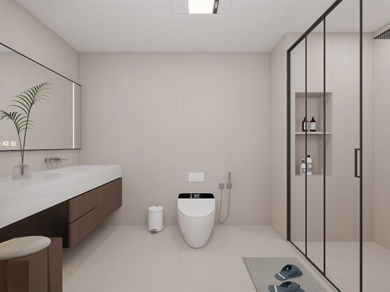 以浅米色为主色调,搭配简洁的白色洁具与黑色边框,营造出干净清爽的氛围。合理的功能分区与充足收纳,方便日常洗漱。绿植点缀增添生机,让这里成为享受舒适卫浴时光的私密角落。