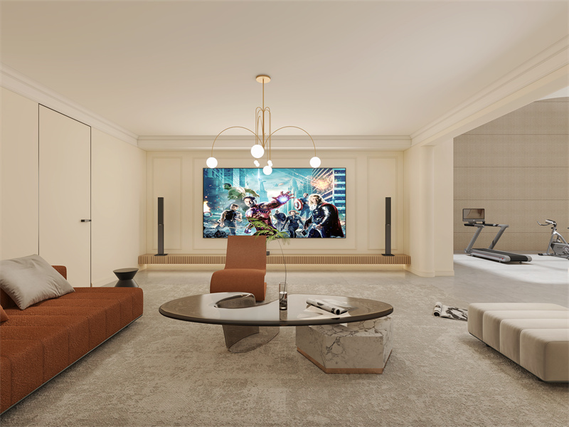采用暖棕与米色的温柔配色,背景墙、造型吊灯增添法式韵味。舒适的沙发与休闲椅布局,搭配大屏影音设备,让居者能在此沉浸式观影、放松身心,打造出兼具格调与休闲感的私享空间。
