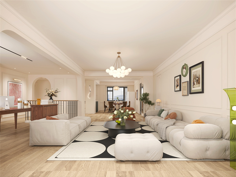 以暖米色为主色调,搭配精致线条与弧形元素,营造出优雅柔和的氛围。圆润的沙发、艺术感地毯,加上绿植与装饰画点缀,既适合家人休闲共处,也能成为好友相聚的惬意场所,尽显现代法式的浪漫与舒适。