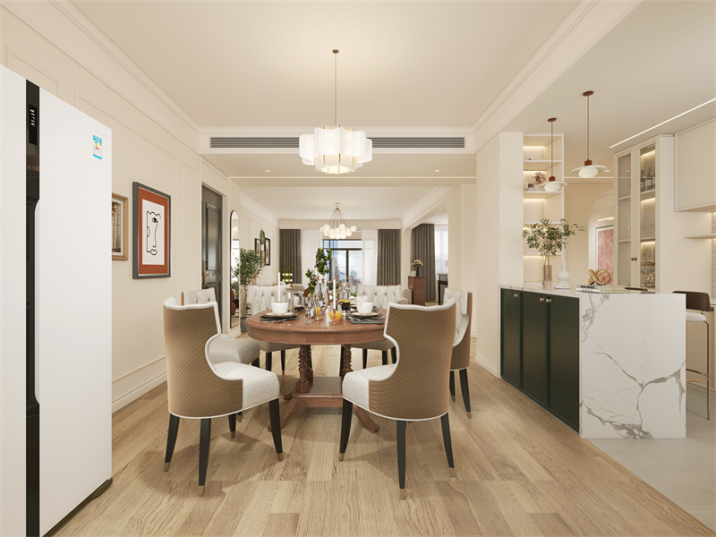 木色与暖白色调相融,造型吊灯为空间注入法式风情。圆桌设计适合家庭围坐聚餐,传递温馨氛围;与厨房区域的衔接,也让备餐、用餐的互动更便捷,是承载美食与亲情的雅致空间。