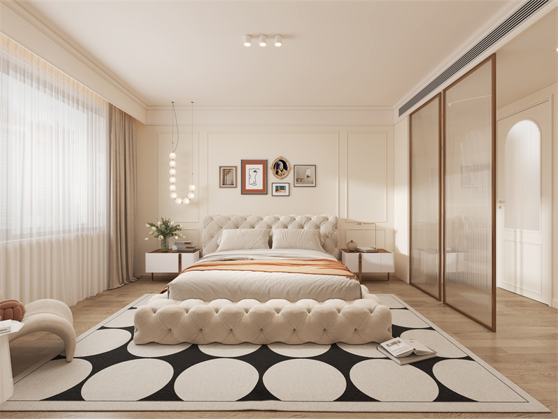本案采用现代法式风格,以暖米色、木色等柔和色调为主旋律,融合法式浪漫的线条元素与现代简约的质感表达,营造出优雅且舒适的居家氛围。