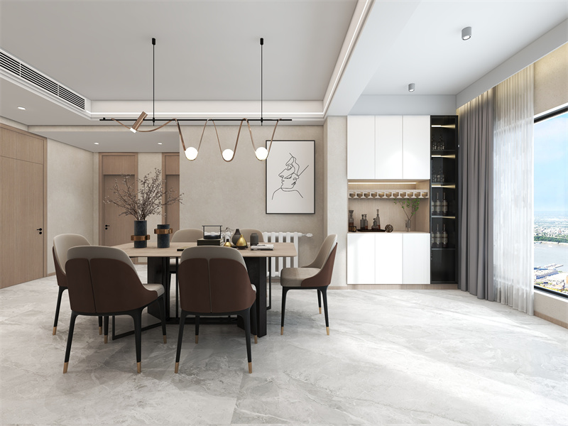 餐桌椅选棕灰拼接款,搭配艺术感吊灯,提升用餐氛围。开放格嵌入灯带展示藏品,封闭柜满足储物需求,大窗引自然光,配合无主灯设计,让空间在精致感之外,兼顾展示与收纳。
