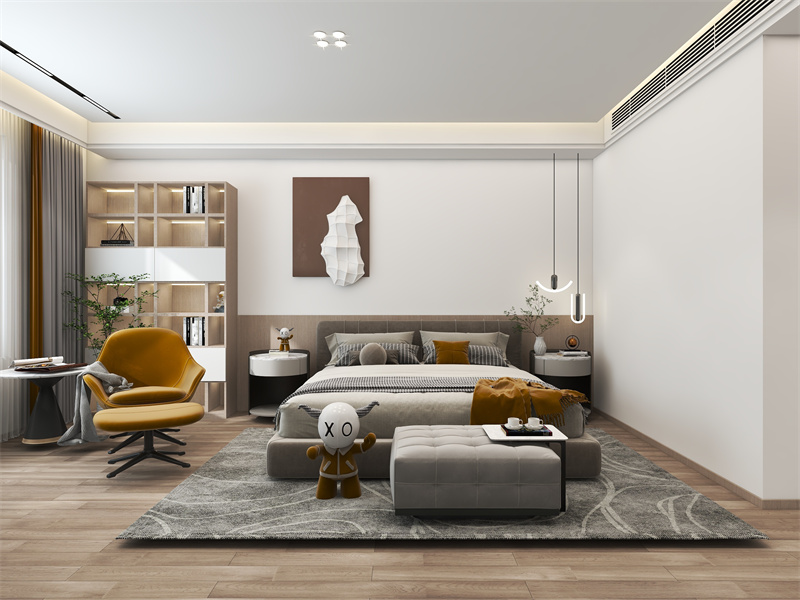 以暖白+原木为基底,用跳色元素激活空间,姜黄色旋转椅作为焦点,打破柔和基调的单调。床头背景做半墙木饰面搭配线性灯,兼顾质感与氛围,潮玩摆件与立体肌理挂画,注入年轻个性。