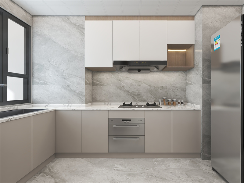 采用“灰白+浅木”的低饱和配色,弱化操作区的压抑感,橱柜做“上浅下深”的分层设计,嵌入灯带的开放格增加操作便利性。家电嵌入式布局,更大化利用空间。