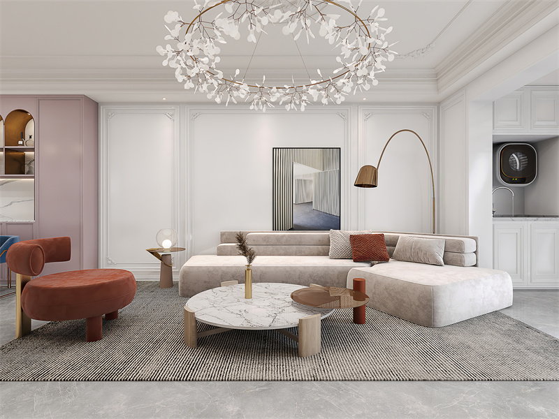 浅粉柜体与纯白石膏线形成柔和撞色,弱化空间单调。沙发选低饱和柔米色,搭配焦糖、浅灰抱枕增加细节温度。金属落地灯、玻璃边几则注入现代轻奢感。