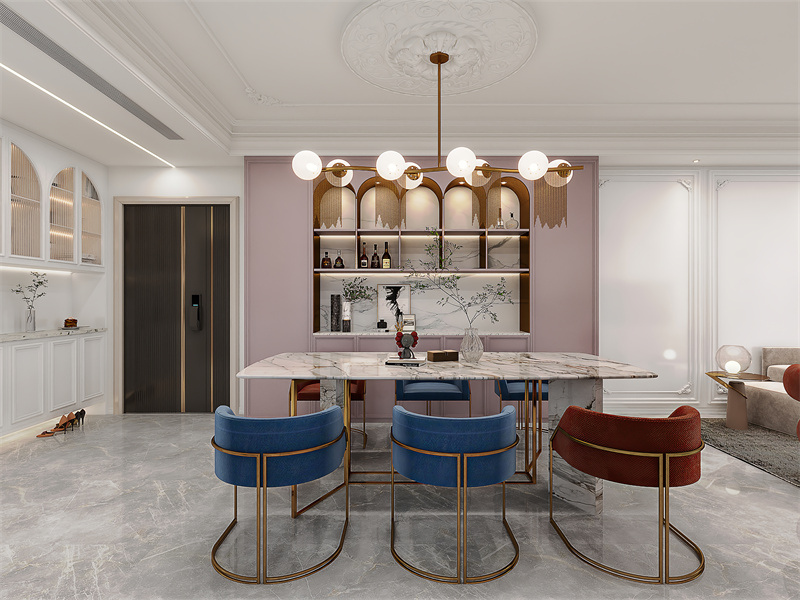 用纯白、柔粉等柔色为基底,通过石膏线条、雕花吊顶等经典元素复刻复古优雅,同时摒弃传统法式的厚重感。用焦糖色、浅蓝等跳色软装打破柔色基调的平淡,实现审美质感与实用功能的双重满足。