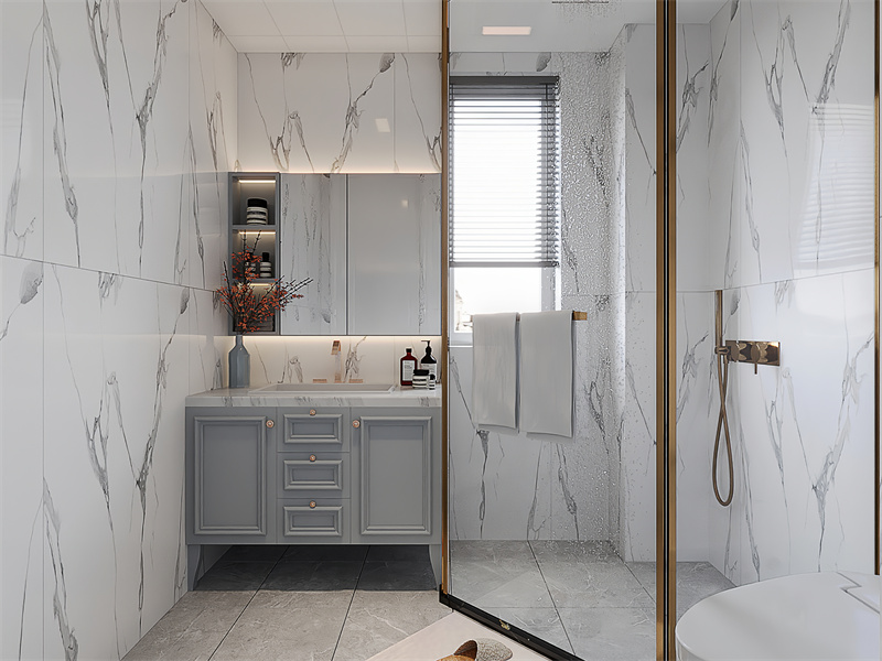 浅灰柜体制成法式线条造型,既保留风格元素,又适配卫浴的耐潮需求。镜柜嵌入灯带提升操作便利性,金色五金件与玻璃隔断呼应,点缀出精致感。